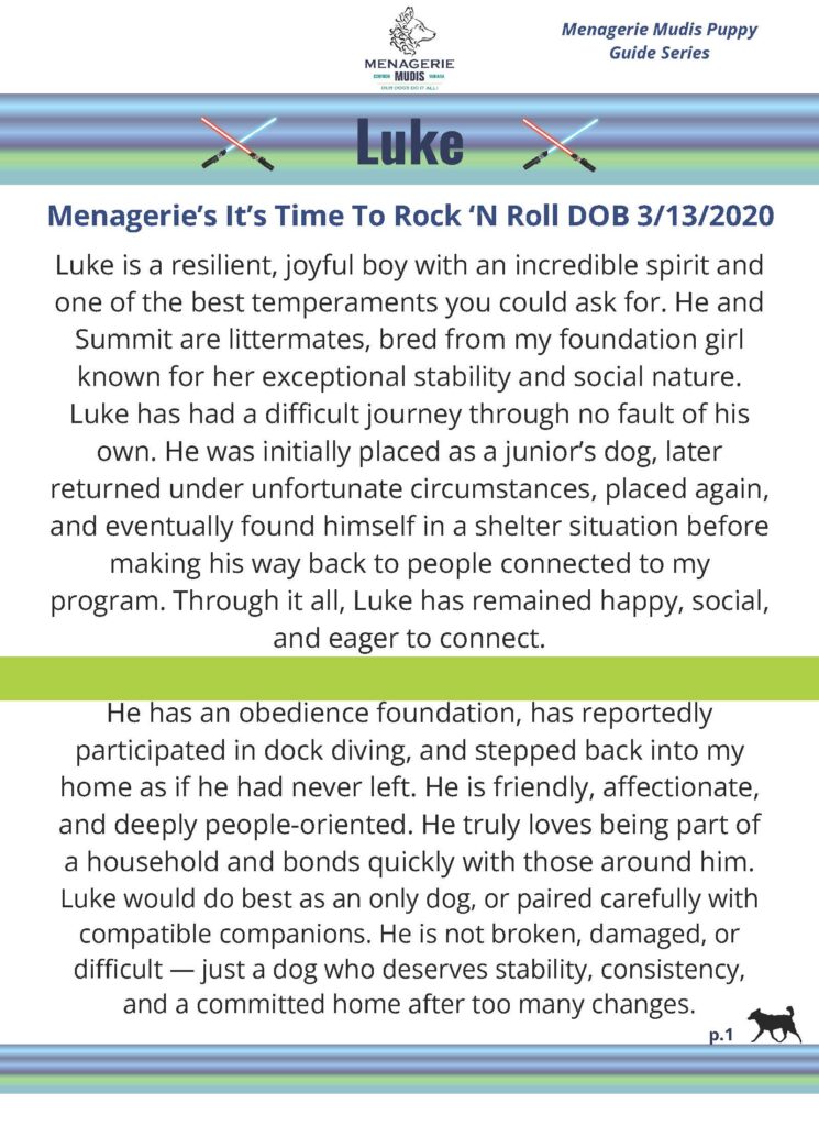Lumos has had a rough road, That is Summit’s littermate. I placed him with a family for a 17 year old’s juniors dog. She eventually found a boyfriend and a Border Collie the boy liked better, and had Lumos drugged in a crate to prevent barking. He does have some obedience foundation and I have been told has done dock diving. After I got him back I placed him with a mother/daughter duo that do flyball. They apparently had too many dogs, had animals seized, and he wound up in a shelter in Iowa. He has been staying with one of my puppy owners that adored him and hoped to keep him. Her 4 year old male Mudi said NO!. He is around. an incredibly happy, social boy. Both he and Summit are from my foundation girl who has the best temperament. Lumos stepped back into our home like he never left.