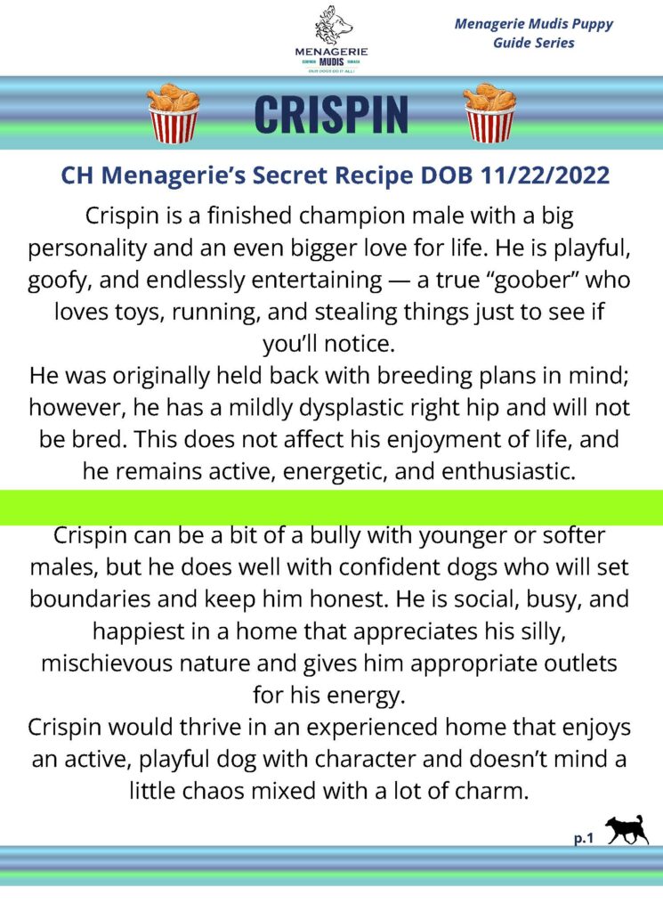 Crispin – CH Menagerie’s Secret Recipe – NOW AVAILABLE FOR PLACEMENT